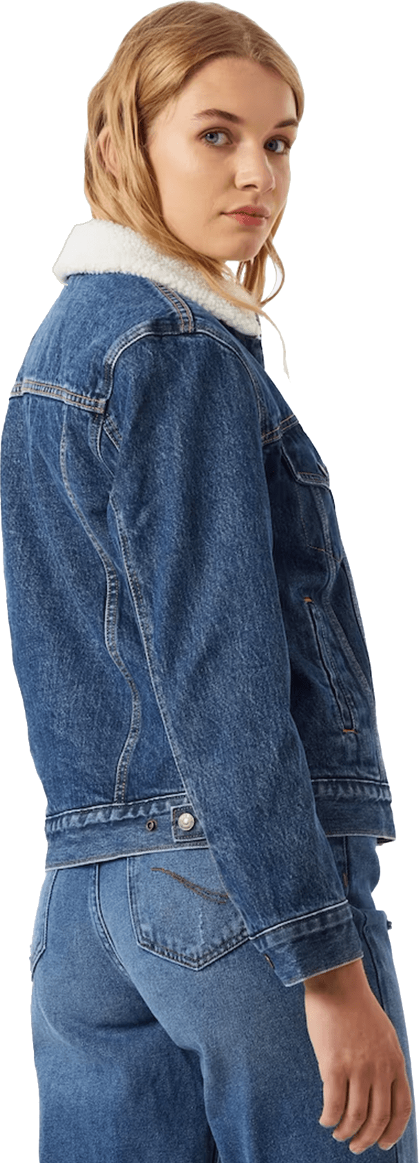 Το κλασικό denim jacket αποκτά χειμερινή ανανέωση με εσωτερική επένδυση από λευκή συνθετική γούνα, που προσφέρει ζεστασιά και στυλ.